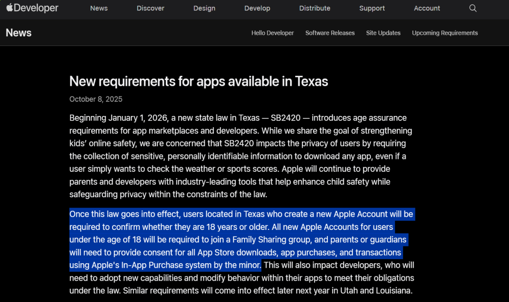 >>520029899I'm assuming it's just when you make an Apple account. You have to provide them your birthday anyway so I'm assuming they just use that.Texas wanted it to be a SHOW GUBMINT ID law but similar laws ended up getting nuked from orbit by the courts so they massively scaled it back to just asking you your age.