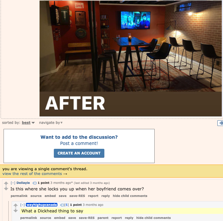 >>520061060The interior design of the woman's space is actually incredibly cringe. Yes, it's better than a totally bland nothing with objects in it. It looks okay in pictures, but imagine being in there. The "brick wall" is a literal laminated sheet. The rug is in a random spot, and the bar stools will constantly be snagging on the edge of it. The bench in the corner is literally going to serve no functional purpose and is on a totally different level from everything else. The chairs that point at the "brick" wall may just be placed like that for storage, but they're like that because the bar table in the centre is too small. The TV is off to the side in a way that nobody will be watching it. The standing lamp is excessive and doesn't belong with the 2 existing lights. Finally, there is a bathroom shelf with bathroom style implements on it, which is just completely off the entire aesthetic. pure cringe