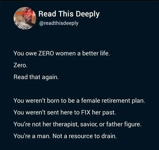 >>520059542>men who choose to remain single and childless?It wasn't by choice, women never liked me. I only supported MGTOW because I supported it's right to exist; I still think it's a cope. Not everyone wants to be a tradcuck and that is fine. But I notice when Trump is in office the "HURR DURR WHERE ARE ALL THE REAL MEN?" bitching is at it's worst. And women think they are victims if they can't get Chad.Overall we can just say "I don't care not my problem" which is great but I hope they don't force more taxes or a draft on us. Our ultimate weapon is apathy, their ultimate weapon is subjugation.