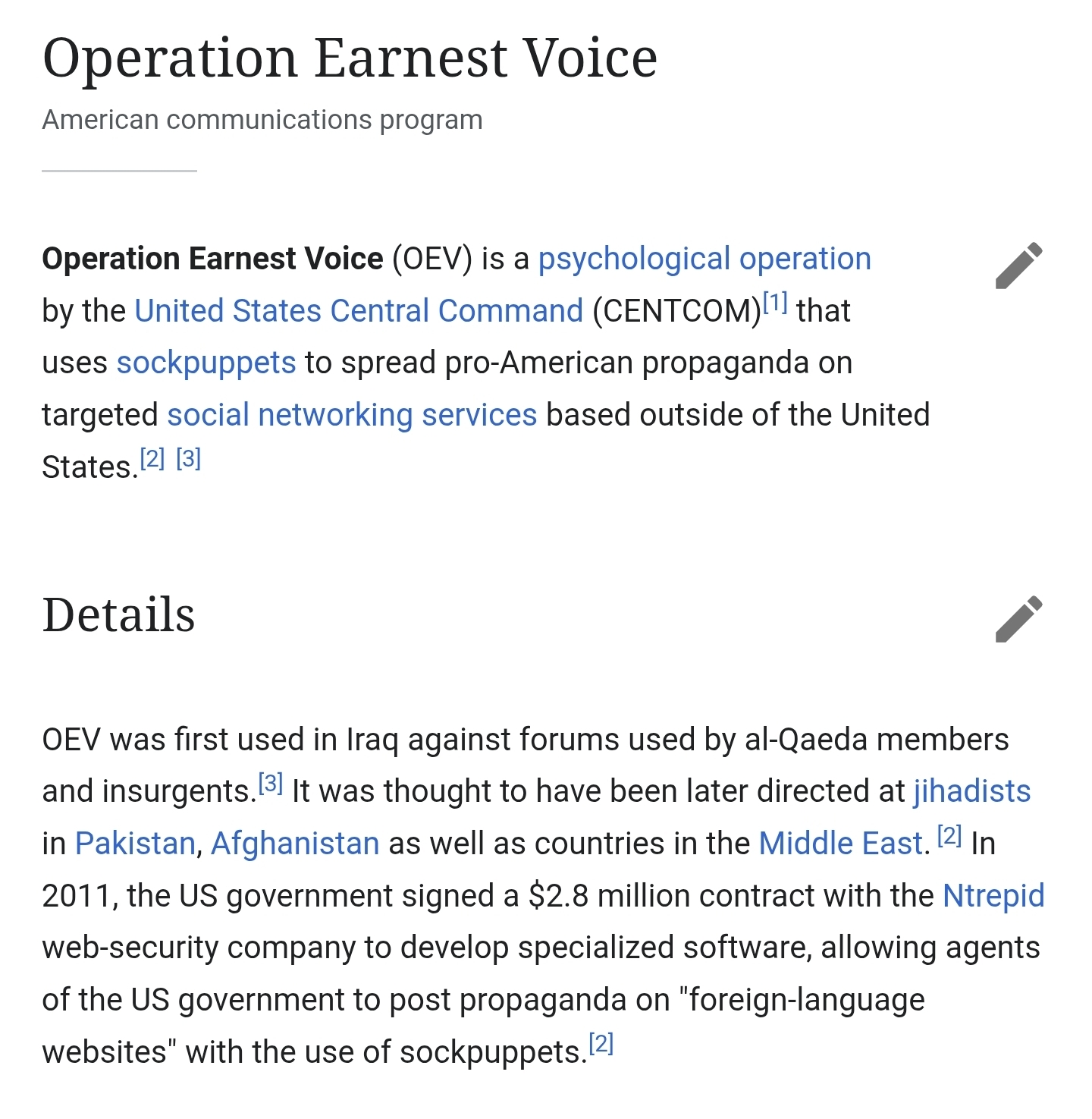 Operation Earnest Voicewas mentioned in an archived post about Nrtrepid. Main characteristics of the software, as stated in the software development request, are:Fifty user "operator" licenses, 10 sockpuppets controllable by each user.Sockpuppets are to be "replete with background, history, supporting details, and cyber presences that are technically, culturally and geographically consistent." Sockpuppets are to "be able to appear to originate in nearly any part of the world."A special secure VPN, allowing sockpuppets to appear to be posting from "randomly selected IP addresses," in order to "hide the existence of the operation."Fifty static IP addresses to enable government agencies to "manage their persistent online personas," with identities of government and enterprise organizations protected which will allow for different state agents to use the same sockpuppet, and easily switch between different sockpuppets to "look like ordinary users as opposed to one organization."Nine private servers, "based on the geographic area of operations the customer is operating within and which allow a customer's online persona(s) to appear to originate from." These servers should use commercial hosting centers around the world.Virtual machine environments, deleted after each session termination, to avoid interaction with "any virus, worm, or malicious software."[4]https://en.wikipedia.org/wiki/Operation_Earnest_Voice?wprov=sfla1