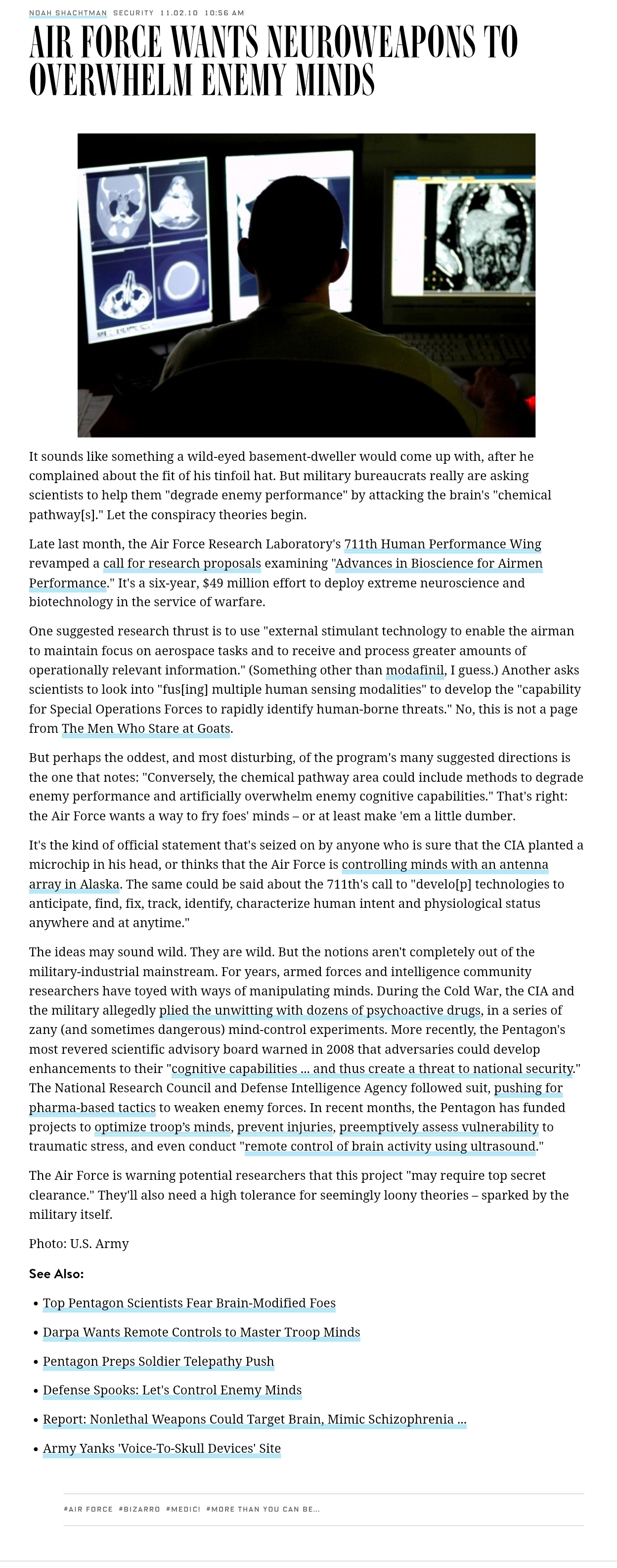 >>520081551https://archive.fo/2018.10.28-224509/https://www.wired.com/2010/11/air-force-looks-to-artificially-overwhelm-enemy-cognitive-capabilities/And to think this is from 2018. imagine how advanced it is now. I have no doubt they are testing more advanced shit here before they try it anywhere else. also interesting video, I have it added to a playlist. I have every archived link posted open and some more from there so I have more tabs open than I know what to do with. Im getting super tired too since its late and I wake up early. I may have to finish researching tomorrow. Just know if I dont respond again I passed out, but it means more to me than you know to finally talk to a real fucking person again on here for once in forever. yes I know that sounds corny and gay. I dont care. thx leaf
