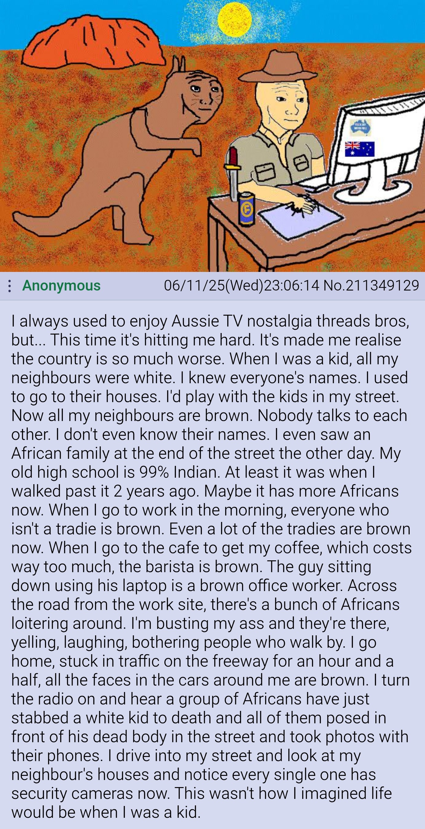 Australia is completely FUCKED>Brisbane is fucking gone. In cbd couple of months ago first time in 7 years. It's fucking brown and black, shifty and makes your skin crawl. The outer suburbs are strewn beyond repair with every fucking foreigner. Schools are full of turbans>go to sydney cbd (York, Sussex, Pitt, Bourke, Brougham Street)>homeless and drug addicts walking around everywhere>go to melbourne cbd (Lonsdale, Bourke, Collins, Flinders Lane)>homeless and drug addicts walking around everywhere>most all homeless or addicts I see are white, tattoos, piercings, drug problems>whites, who won't work for slave wages, who know there ARE work protection laws, are not hired. pushing them to the bottom of society. THAT is where they destroy themselves FOR the government with drug abuse etc>kill Holden because Australian wages were high. They only kept the Australian factories open because they got a bunch of money from the Australian government>chinese and indians buying up land/businesses and homes, while we keep importing them over by the boatload, replacing the anglo-saxon stock>Indians lower our wages because they're willing to work for min wage and free overtime, Indians definitely prefer hiring their own>ethnic conflict between chinese and indians>blatant difference in academic integrity with the Indian international students. And because they made the unis so much money, professors were powerless to punish or fail them>they mostly form ethnic enclaves all the while importing their conflicts (see Hindus vs khalistani’s)>blatant difference in academic integrity with the Indian international students. And because they made the unis so much money, professors were powerless to punish or fail them>Punjabis are running from crime and bringing that attitude here>Indians in Australia openly hate Whiteshttps://x.com/clowndownunder/status/1938108471549059398>no car industry