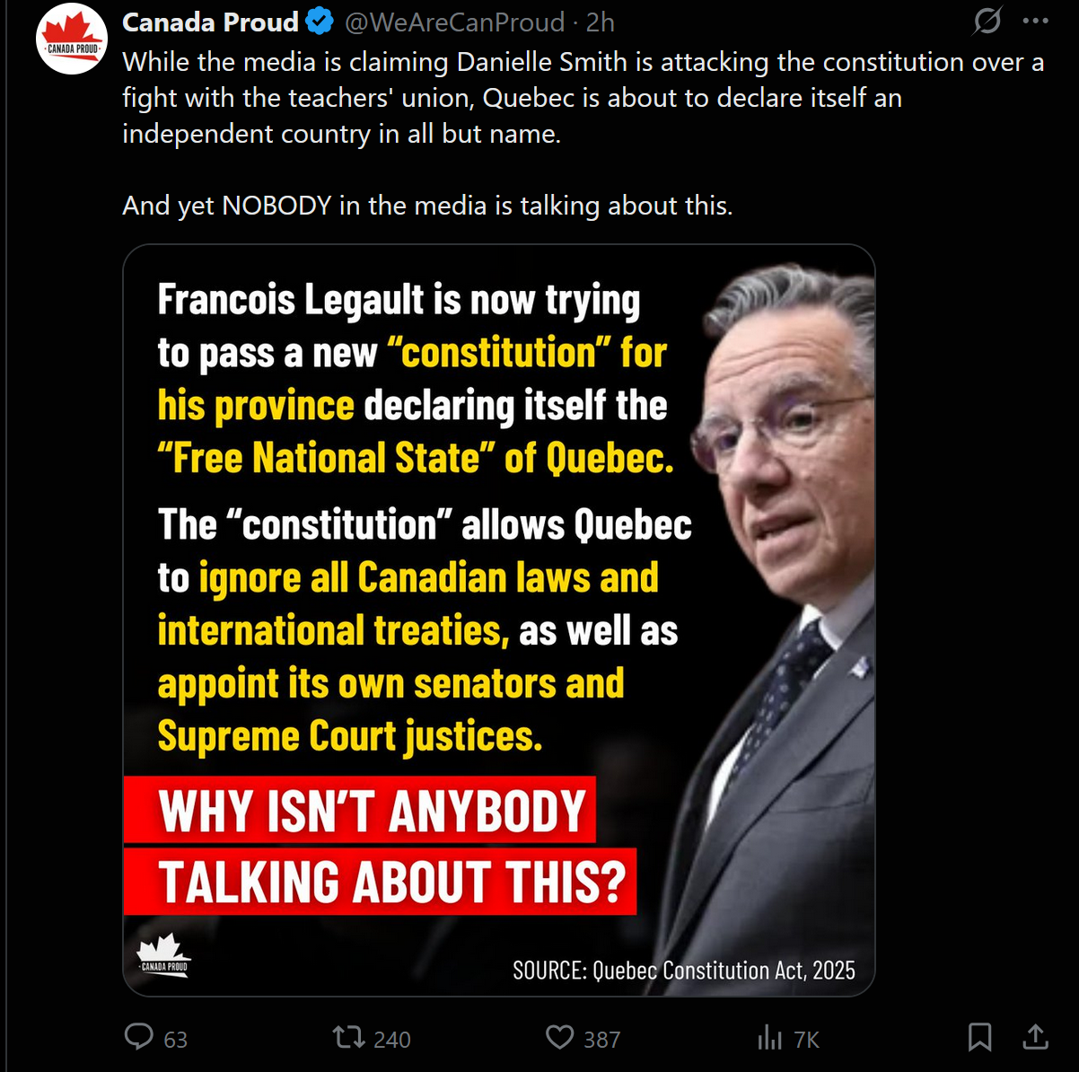 Man I hope the Canadian Federation really does collapse. Alberta's vote to leave is next year and Quebec looks to be doing it too