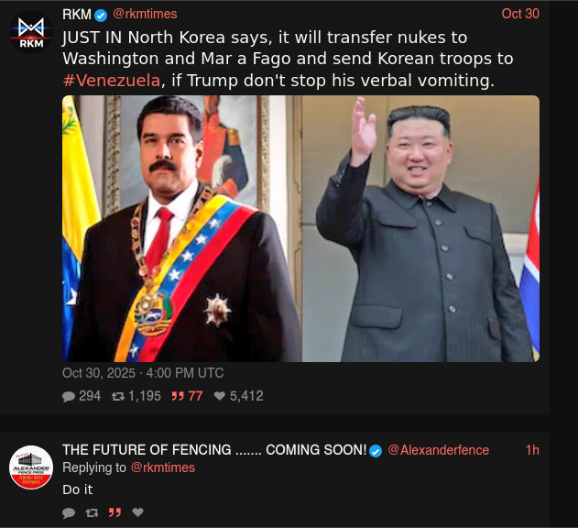 >>520270415No, this is all part of a psychological warfare. Ideally it would be good if maduro just leaves and never comes back. This also puts pressure among the others members of the cartel de los soles. Of course they want to save themselves, but the question is who do they betray and hand over to USA? Now that an attack is confirmed is coming, this puts the damocles sword over their head.