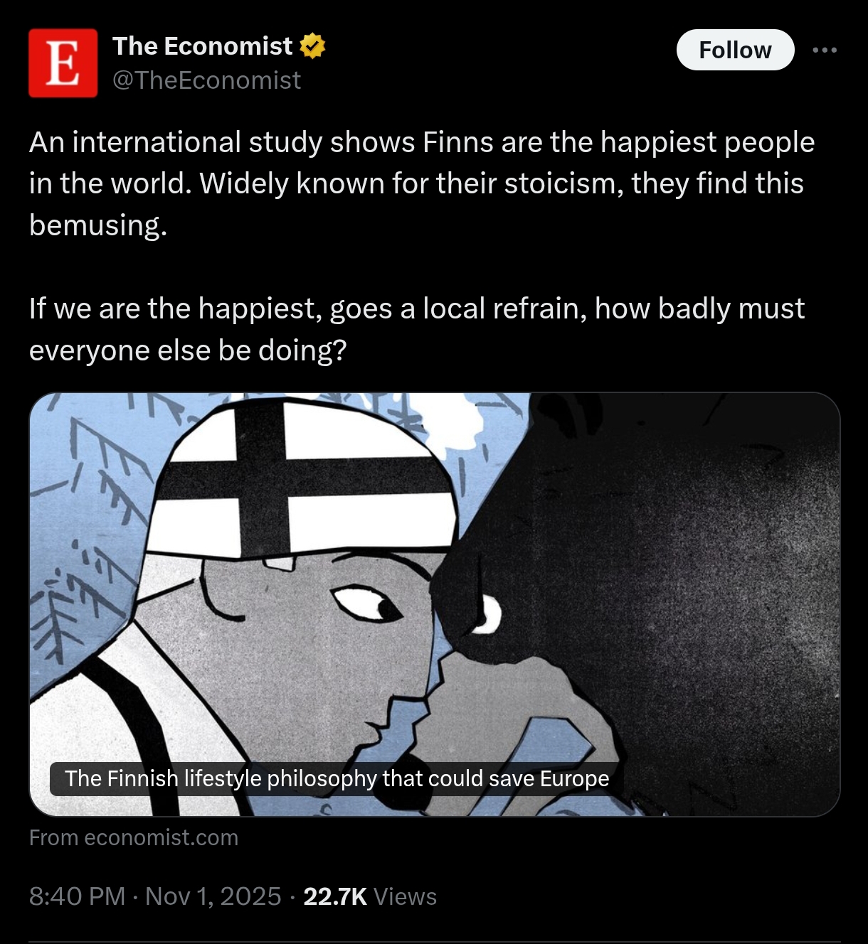 >If events are making Europeans feel helpless and depressed, Finns might say, what is needed is more sisu. The war in Ukraine, for instance, highlights “the importance of psychological resilience”, says Annukka Ylivaara, the deputy head of Finland’s national security committee. The committee brings together all relevant ministries and agencies to plan for potential threats to Finnish security. Guaranteeing psychological resilience, she explains, means ensuring that Finns can still pray, visit museums and play sports amid a crisis. But it also means empowering citizens to take part in national defence themselves, making them feel they are active contributors to the country’s security.When stoicism isn't enough become Finnish.