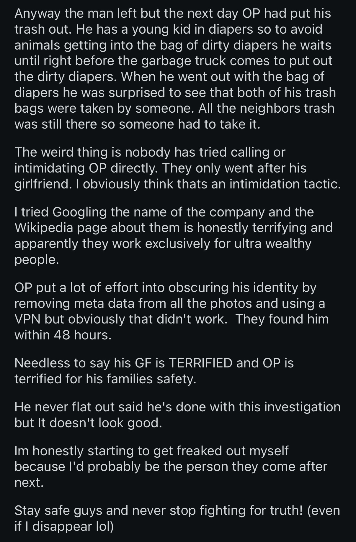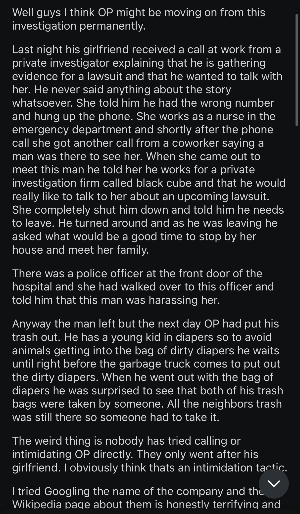 First update from guy communicating with OP v2>>520401180I mean, he’s delivered with actual pics of the business card/trash etc. not sure what else you could ask for. And i don’t feel like his posting is too vague other than not mentioning an exact location.Original reddit post got wiped not long at all after it was up, then the guy claims his gmail, and all google accounts have been wiped etc, and has been communicating with this other redditor who is posting everything else through a protonmail.>>520401243It’s real.https://www.blackcube.com/https://www.blackcube.com/case-studieshttps://www.blackcube.com/services