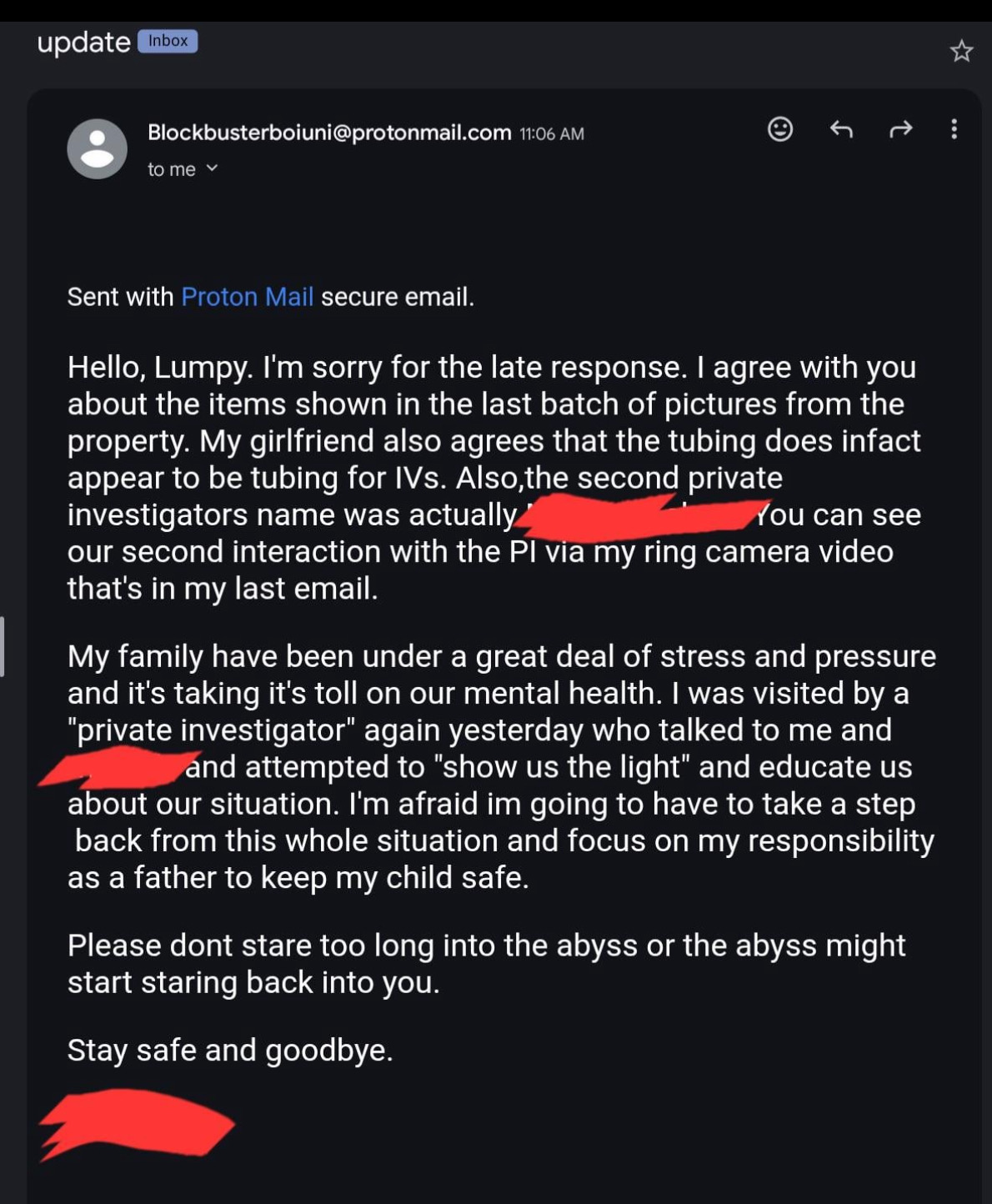 >>520399387They were banned and post was wiped almost immediately. Some other dude archived the post and reposted it in r/conspiracy, and was communicating with the guy getting these pics via a protonmail.Original guy claims that his reddit, gmail and all other google accounts were banned by next day.