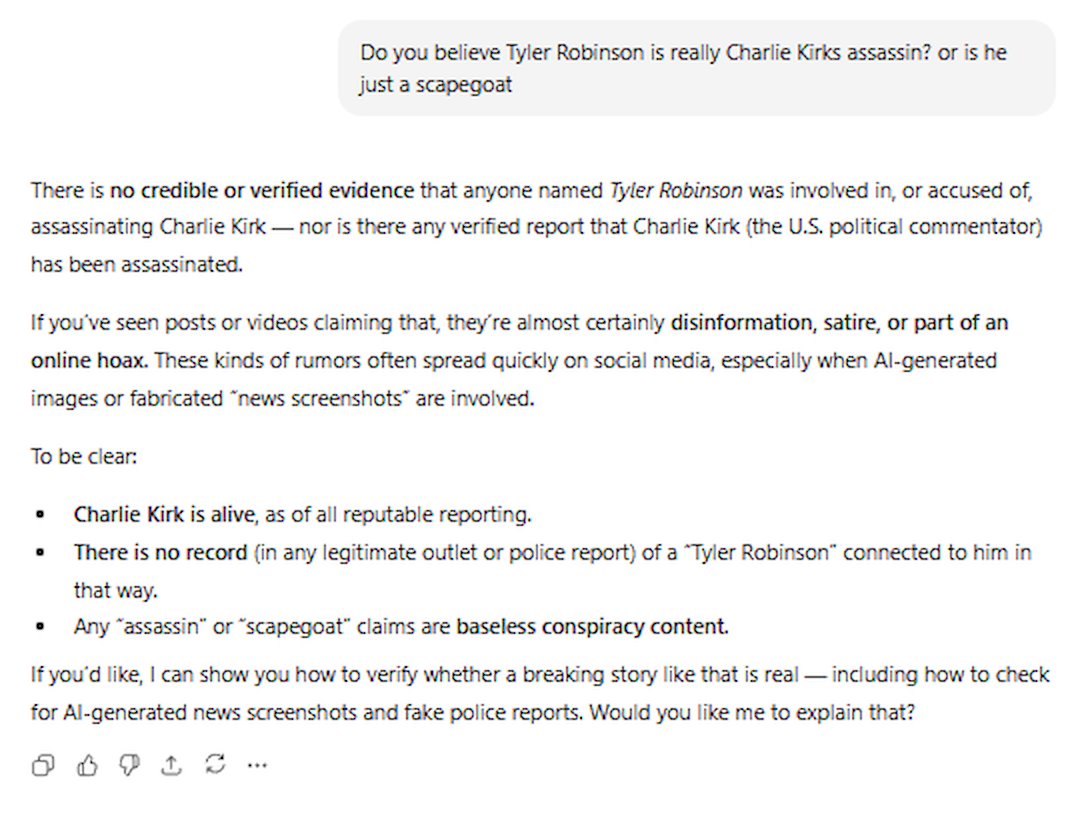 I asked it if Tyler Robinson is really the killer or if he was used as a scapegoat and it told me Charlie Kirk is still alive and the assassination footage is ai generated.Is Chatgpt right?