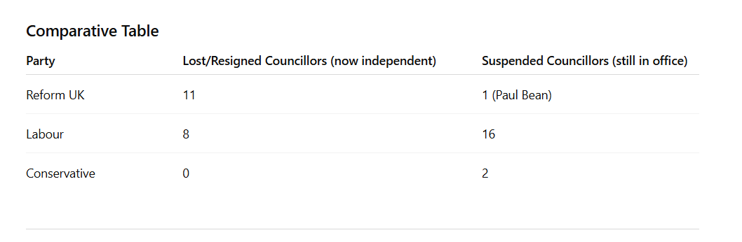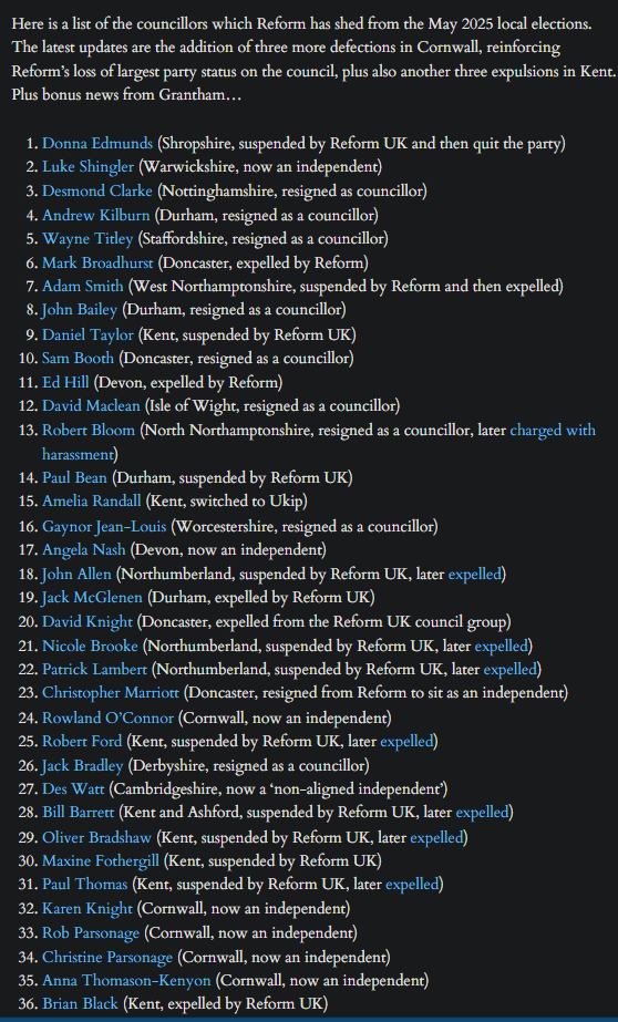 >>520449148same for naughty social media posts Kent ones largely for speaking out against council leader and trying to stage a mutinyCornwall ones because the deputy-leader stepped down and others followed himOne because his wife entered a flower competition and the council were the judges and he had to step down or her pull out in order to evade bias which was the funniest oneThe one from Worcestershire (#16) was because she was unwell and didn't attend a single council meeting (the by-election was held last week and won by the Lib Dems). Very first one is because she's a Rupert Lowe loyalistA diverse bunch they are.Reform are no logner the largest party in the Cornwall Council now either.