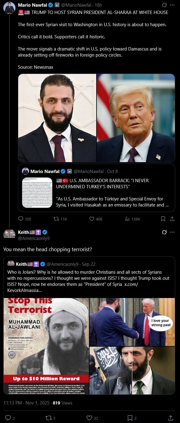 Crazy we had a $10million bounty on this guy for being an al-qaeda terrorist persecuting Christians since 2003, until just over a year ago when it was dropped as he emerged the de facto head of state after overthrowing Assad, and now has Christians persecuted all throughout Syria.But muh Nigeria. Fucking Lindsey Graham tier foreign relations. McCain's legacy lives on.