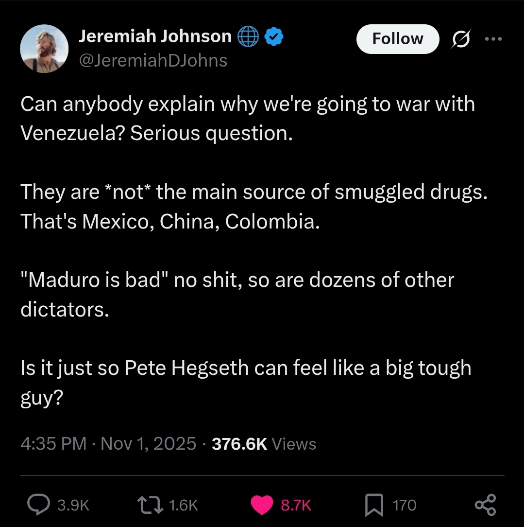 >>520493781Sure, but I don’t see John Bolton getting a hard on for war with Venezuela.The main neoconservative projects are Ukraine and then Israel (middle east). A war with Venezuela could draw resources AWAY from Ukraine. > muh oilAlso bullshit. That crap is everywhere. It is made artificially scarce on purpose.No, I think Trump just wants to kill some drug dealers. He is not a religious man. He is a teetotaler. He does not give a fuck about spilling some blood in LATAM. Why should he? Blood is being spilled all over the world right now.