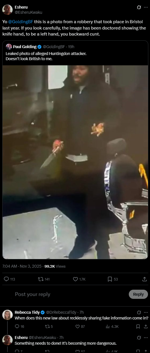 >>520496270>hello, police, there's someone outside screaming about wanting to cut people's heads off!>he's a danger, people are in immediate threat. send help!>also i think i saw a reform badge on his coat