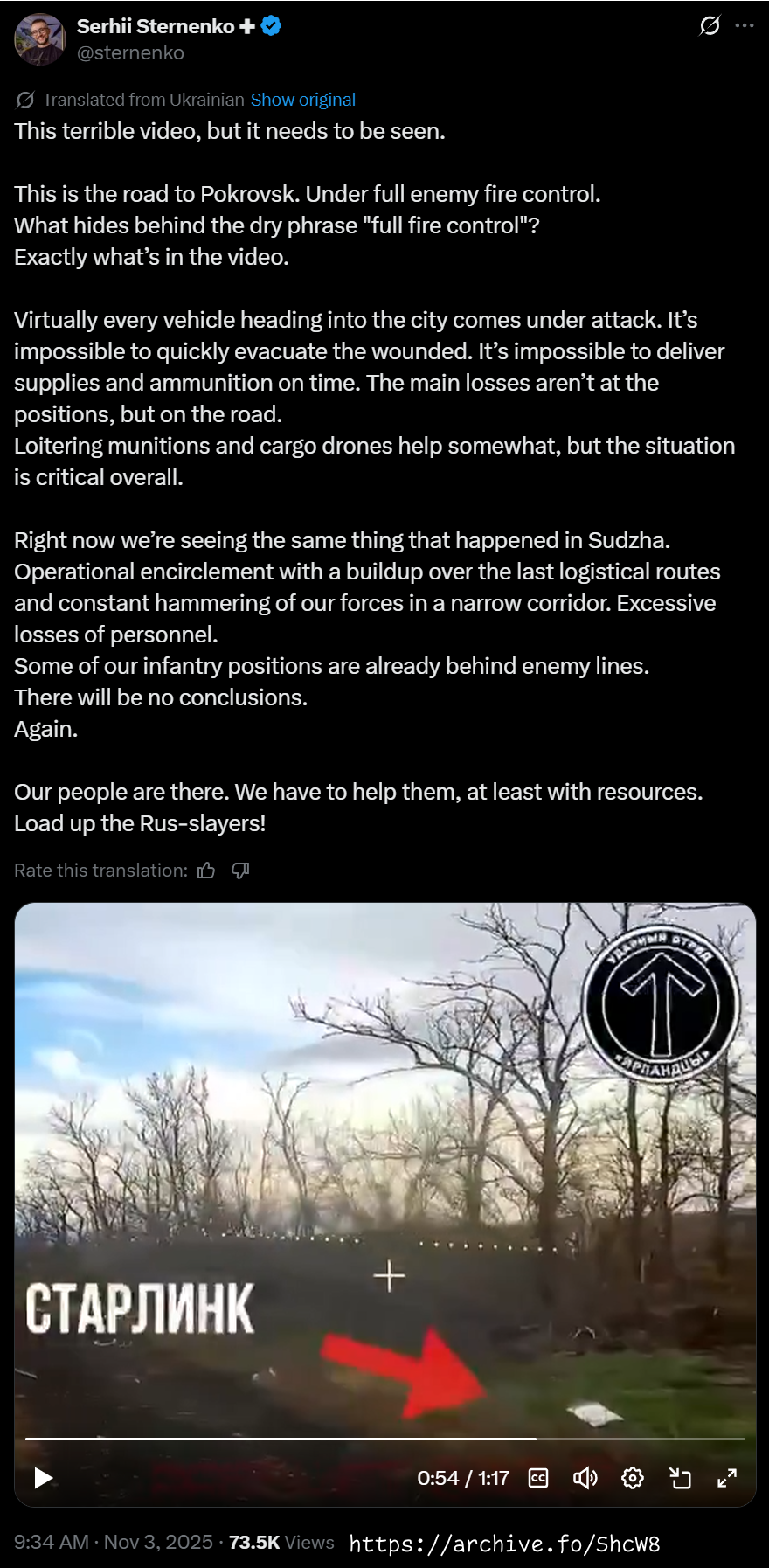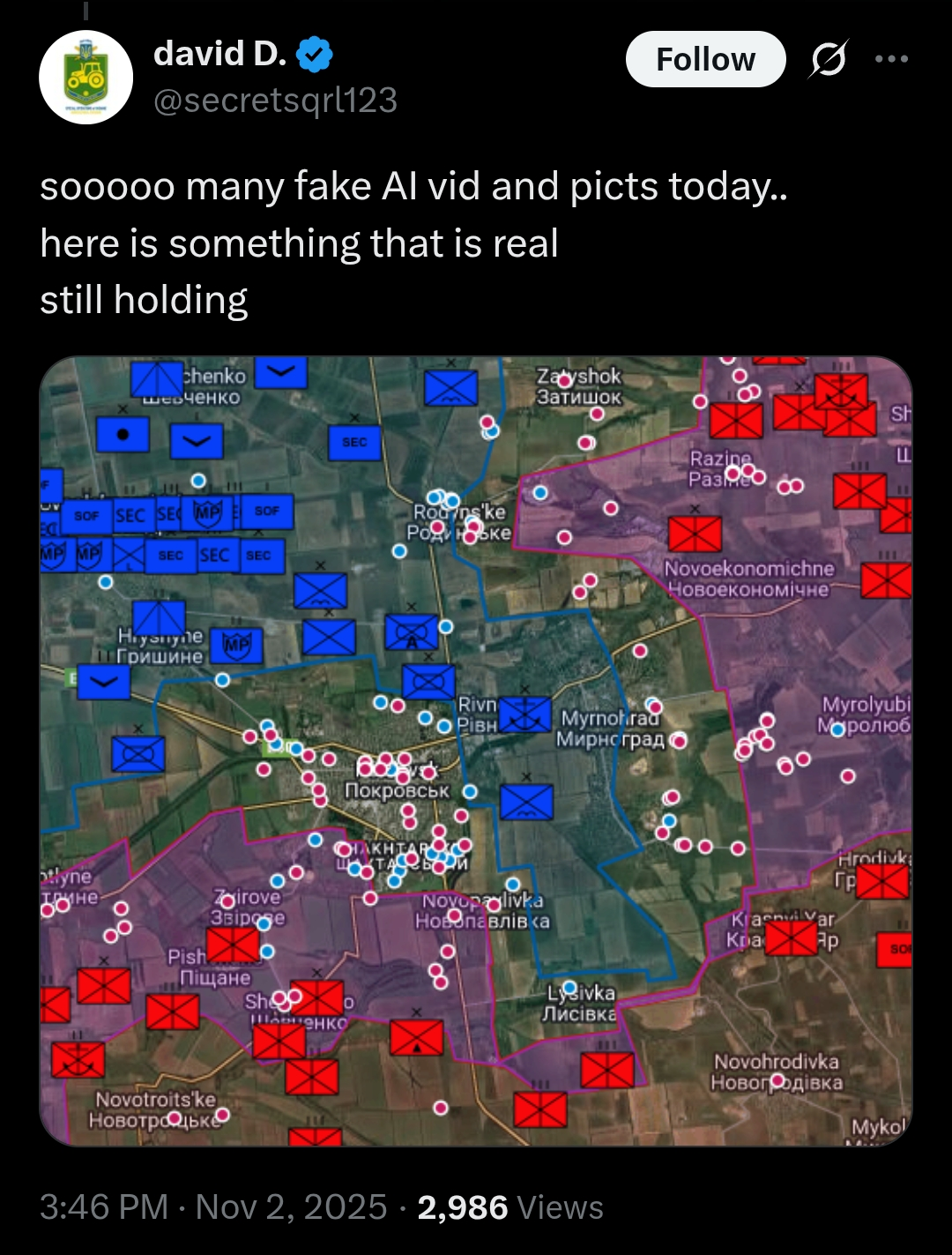 >>520552630Apparently they've sent out multiple assaults from Hryshyne to breakthrough to the Mirnograd pocket (I no longer count it as the Pokrovsk/Mirnograd pocket).The Ukrainians are making all sorts of claims of success.First of all that the black hawk HUR landing was a success and the Russians have been driven out of the industrial zone near Hryshyne.The other is that the Ukrainians have taken the road from Rodynske to Pokrovsk.All pro-hohol mappers have resorted to using 5km thick greyzones so as not to contradict Syrsky's lies