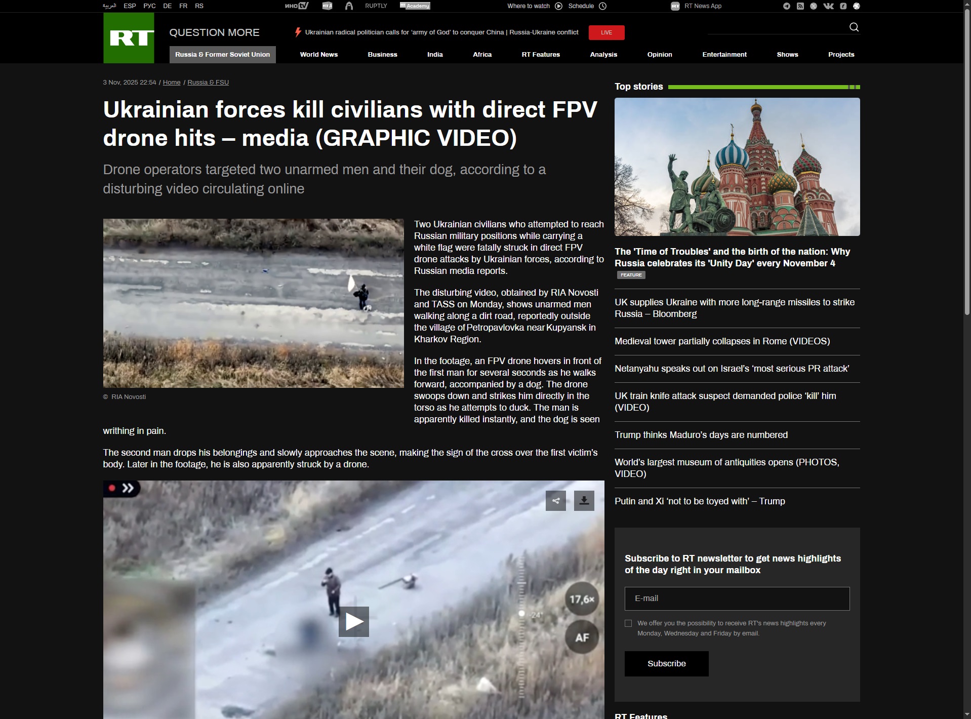 ▶NEW CLIPS>NOT COMFY, cyborgi subhumans fpv old man, then fpv a man giving final rights to the deceased, and his doghttps://files.catbox.moe/sa6mrz.mp4>HUR Blackhawk Mission Failure, extended, 8 confirmed dead HUR spetsgruppahttps://files.catbox.moe/zy3kuw.mp4>Lancet destroys Ukrainian BUK-M1https://files.catbox.moe/stdg2a.mp4>TND merc fpvedhttps://files.catbox.moe/4l4qhi.mp4>Liberation of Vishnyovoyehttps://files.catbox.moe/q07ppq.mp4https://files.catbox.moe/oekjea.mp4>HUR Spetsnaz who were air dropped by Black Hawk behind Russian lines picked off one by onehttps://files.catbox.moe/e36vr2.mp4>Geran-2 raids on Konotop, Sumy railwayshttps://files.catbox.moe/zp3dau.mp4>Kiev CHP-6 Powerplant destroyedhttps://files.catbox.moe/2g2s6n.mp4>Good morning Kherson, 10/24/2025https://files.catbox.moe/6w6zq9.mp4>North Korean Veterans of Kursk march while singing To Serve Russiahttps://files.catbox.moe/s85ufe.mp4>Kiev at night, 10/10/2025https://files.catbox.moe/wenlx1.mp4https://files.catbox.moe/7qfa4i.mp4https://files.catbox.moe/7m3ueu.mp4>The Ukraine's Counter-Offensive to retake Krasnoarmeysk ends in boiling coffinshttps://files.catbox.moe/kc7rs3.MP4>Kharkov, 10/05/2025https://files.catbox.moe/2vaq24.MP4https://files.catbox.moe/8g7jlq.MP4https://files.catbox.moe/s7i0h5.MP4https://files.catbox.moe/8evzj4.MP4https://files.catbox.moe/5v2bkn.mp4>Lights out in Chernigovhttps://files.catbox.moe/hbyvl5.mp4>DRG Spetsnaz liquidate SBU convoy behind enemy lineshttps://files.catbox.moe/o51o63.mp4▶Archivehttps://rentry.org/chugvidz