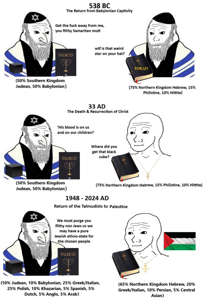 >>520569426astounding levels of irony, as I said, completely raped and owned by jews>you are brainwashed by jews into thinking they are israelites, a completely irrelevant, vile, conquered people from antiquity with fake history and no accomplishments whatsoeverNOOOOOOOOOOOOO daaaaaamn I'll have to bo content being a humble inheritor of those pesky Graeco-Romans, definitely inferior to le epic Israelites