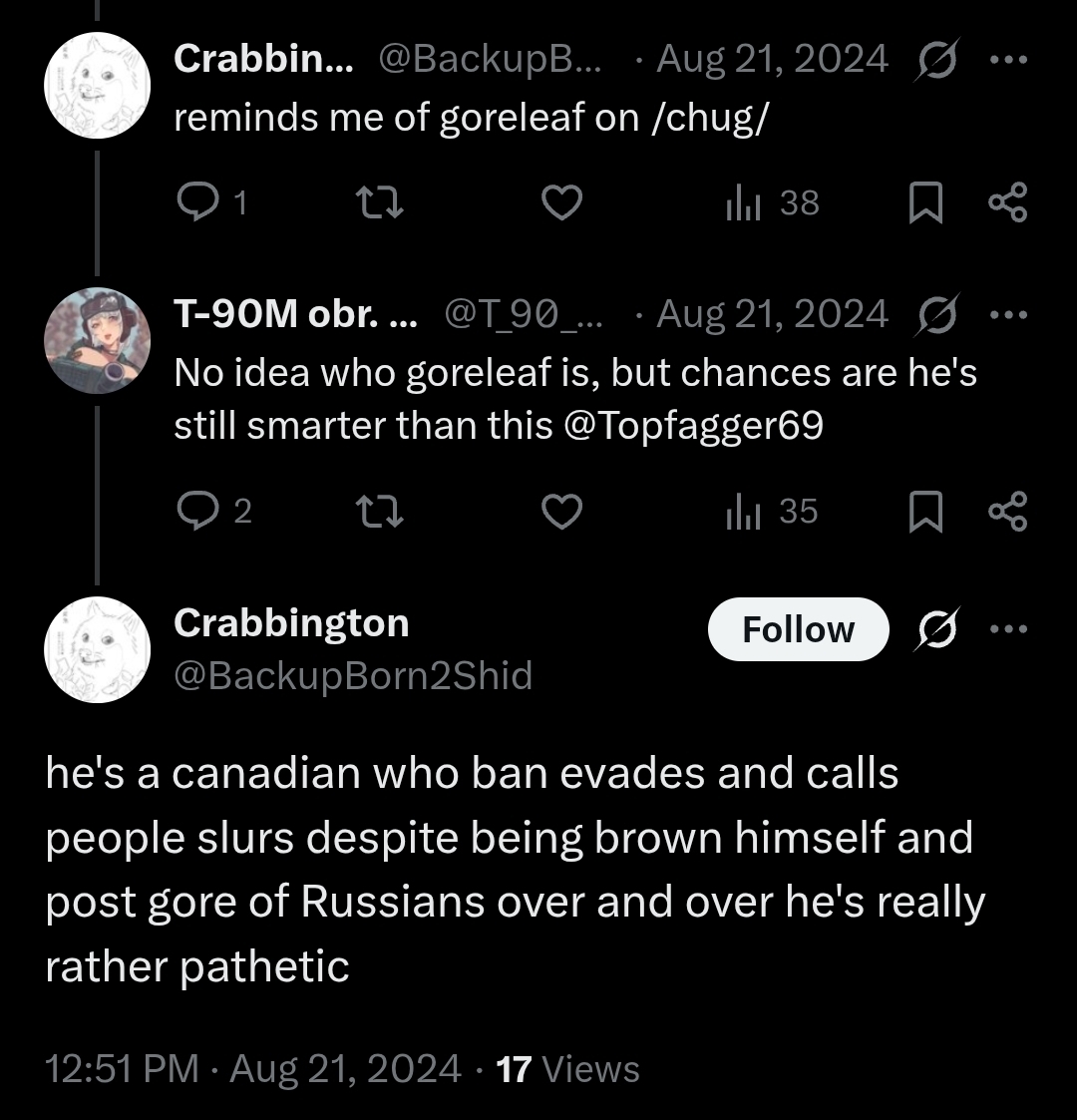 >>520827160>look at this disgusting creature who apparently has adopted goreleaf as its nearest father figurekeep up the good work.