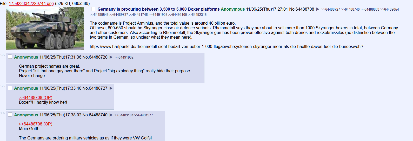 >>520828177kinda but thats just the skyranger version that can shoot down fpv's etc.the boxer is modular so you can put a 155mm arti gun module on it that can shoot on the movehttps://www.bmvg.de/de/aktuelles/pistorius-uebergibt-erste-radhaubitze-rch-155-an-ukraine-5876068these will be tested on ziggers too