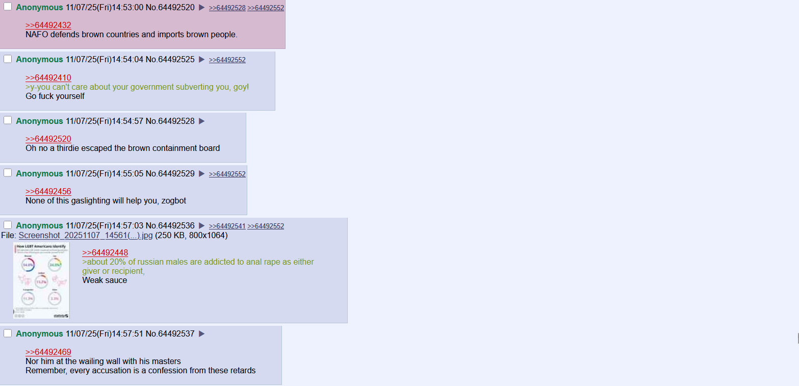 >>520831686>go fuck yourself KekDidn’t read your crying in all honesty I wish you all were more passionate rather than boring zombies No passion in the gore posting, no backstories, no invocation of emotions So very boring No real patriotism or pride, just zombies