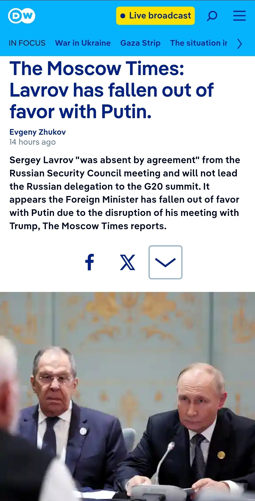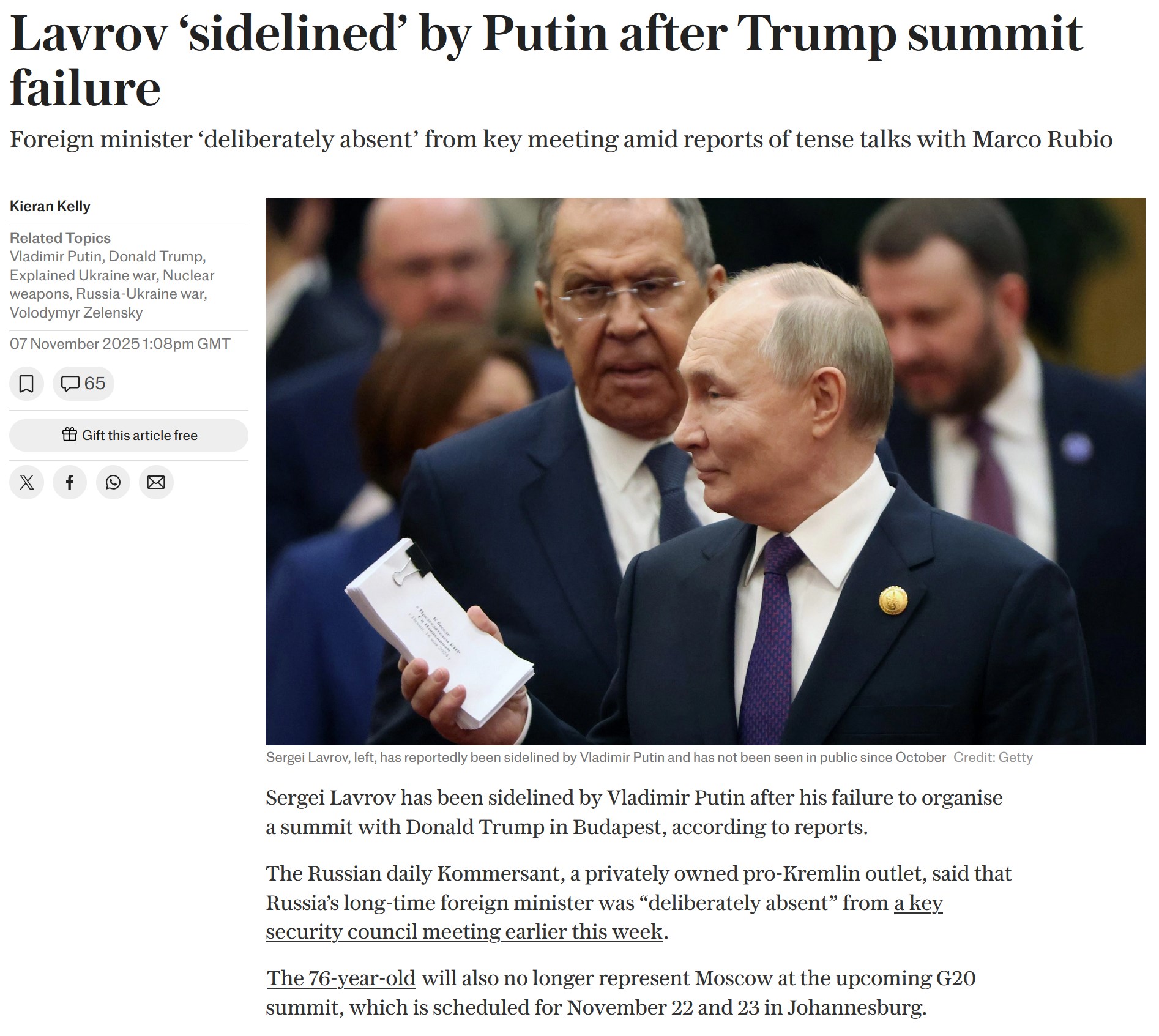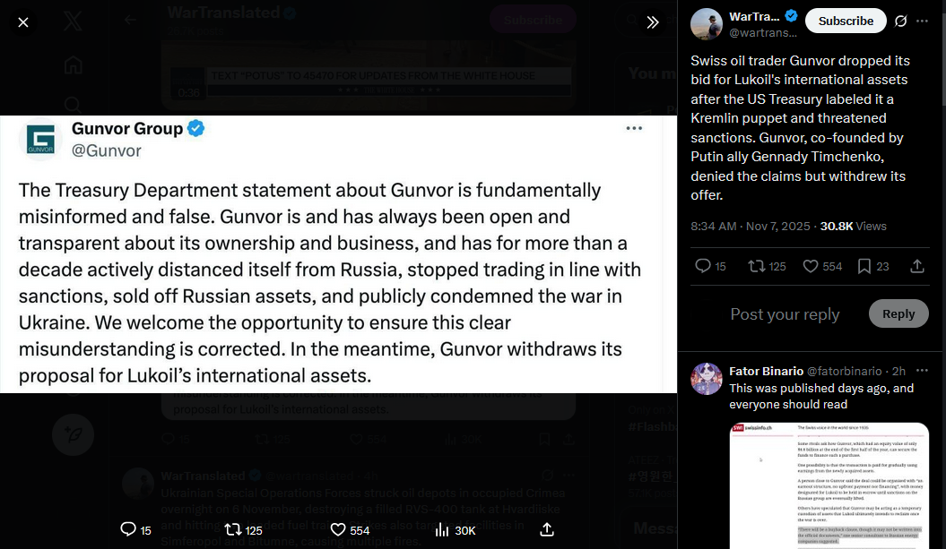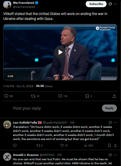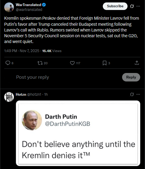 Kremlin spokesman Peskov denied that Foreign Minister Lavrov fell from Putin’s favor after Trump canceled their Budapest meeting following Lavrov’s call with Rubio. Rumors swirled when Lavrov skipped the November 5 Security Council session on nuclear tests, sat out the G20, and went quiet.https://x.com/wartranslated/status/1986793103508783266