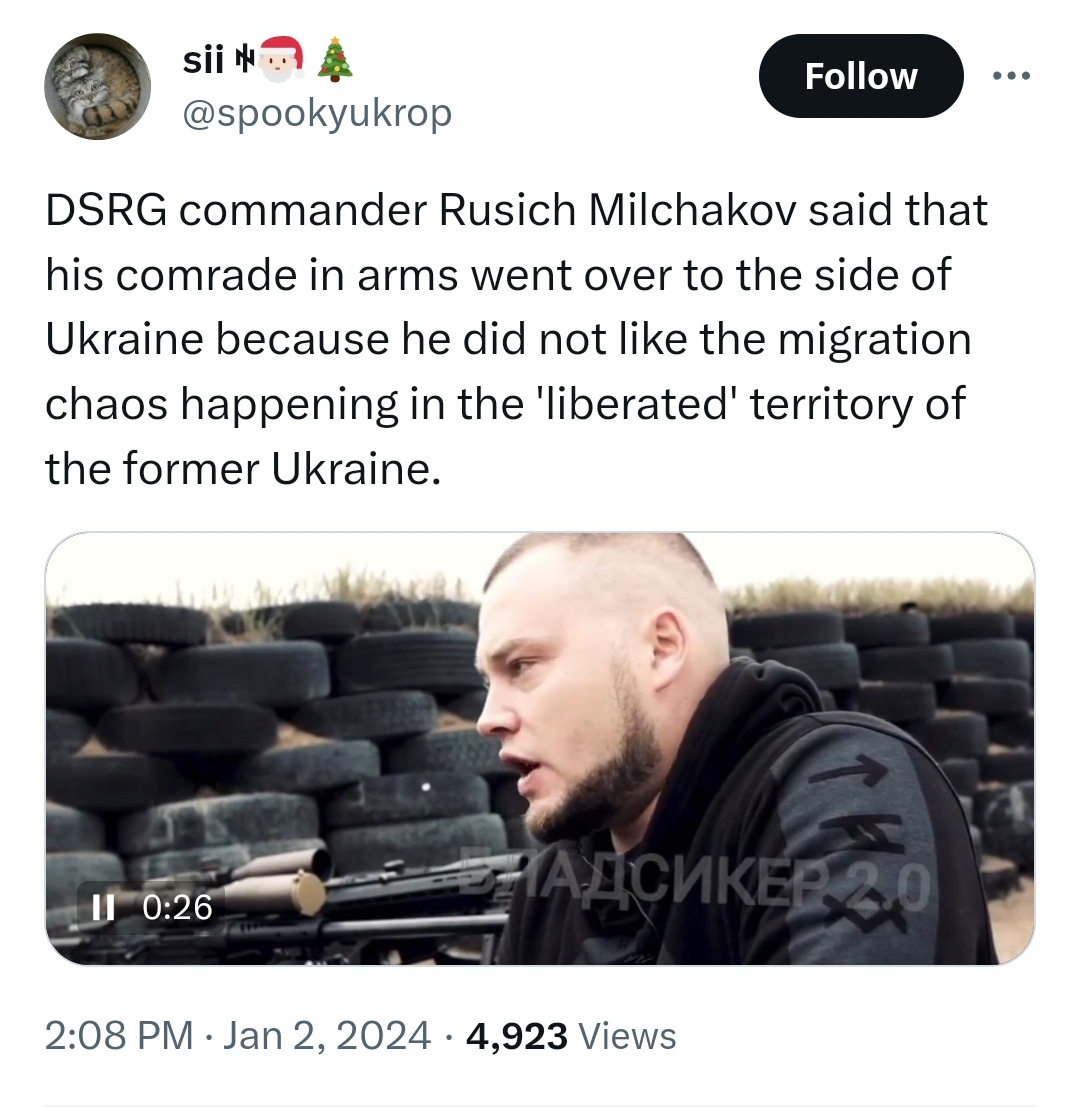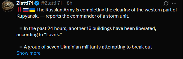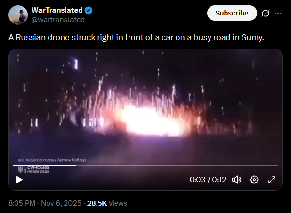 >>520826687Russians have slowed their push on Pokrovsk and cut back on movements, waiting for reinforcements while trying to sneak supplies through the southern outskirts. Ukrainian forces stopped multiple infiltration attempts into Hryshyne by Russians dressed as civilians, reports 7th Air Assault Corps.https://x.com/wartranslated/status/1986786459450319275https://files.catbox.moe/p7u35d.mp4