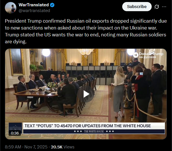 President Trump confirmed Russian oil exports dropped significantly due to new sanctions when asked about their impact on the Ukraine war. Trump stated the US wants the war to end, noting many Russian soldiers are dying.https://x.com/wartranslated/status/1986720038963790162https://files.catbox.moe/dx9rqe.mp4