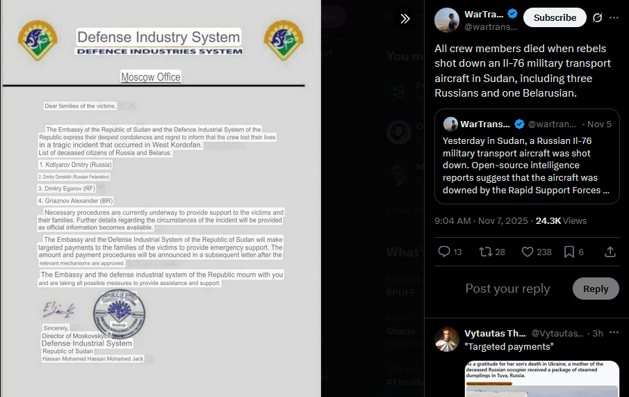 >>520826687 Potato downAll crew members died when rebels shot down an Il-76 military transport aircraft in Sudan, including three Russians and one Belarusian.https://x.com/wartranslated/status/1986721318109098402https://files.catbox.moe/vb8pnm.jpg