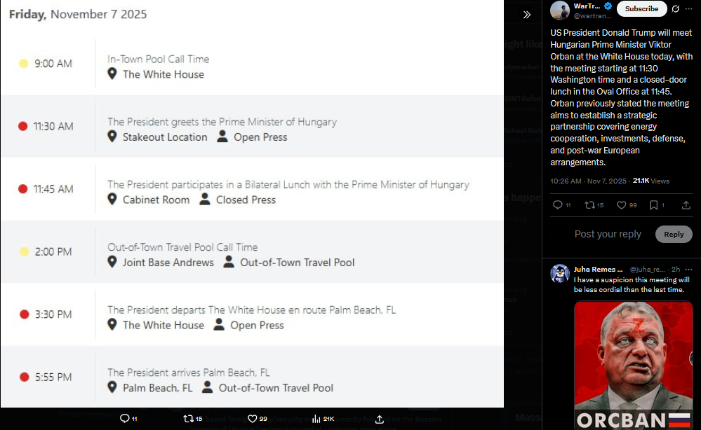 US President Donald Trump will meet Hungarian Prime Minister Viktor Orban at the White House today, with the meeting starting at 11:30 Washington time and a closed-door lunch in the Oval Office at 11:45. Orban previously stated the meeting aims to establish a strategic partnership covering energy cooperation, investments, defense, and post-war European arrangements.https://x.com/wartranslated/status/1986742022040952964>collects welfare from the EU, begs Trump, who's the begger now?