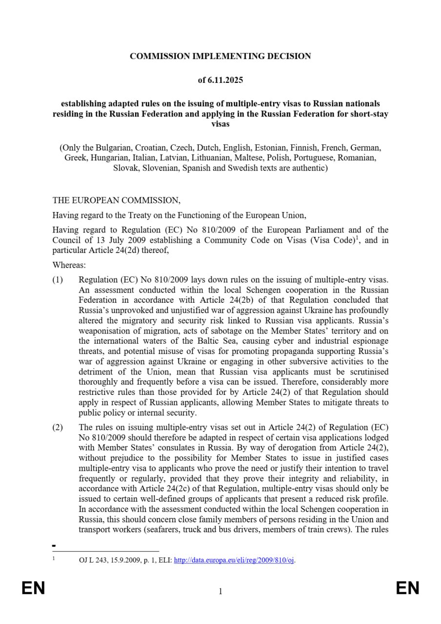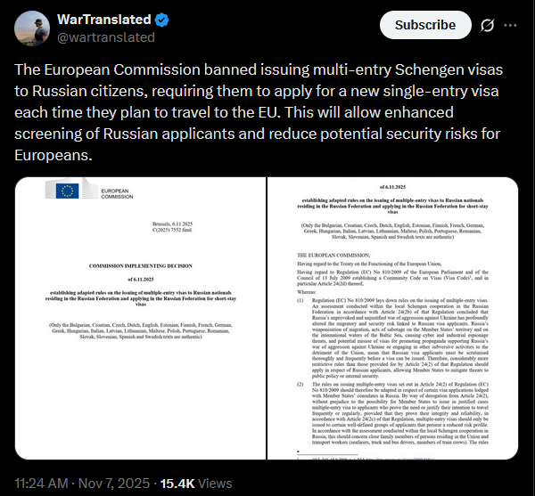 >>520826687 You aren't welcome Here anymoreThe European Commission banned issuing multi-entry Schengen visas to Russian citizens, requiring them to apply for a new single-entry visa each time they plan to travel to the EU. This will allow enhanced screening of Russian applicants and reduce potential security risks for Europeans.https://x.com/wartranslated/status/1986756752063242673pic 1https://files.catbox.moe/wdxs6r.jpgpic 2https://files.catbox.moe/0yj4f3.jpg