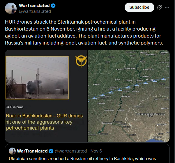HUR drones struck the Sterlitamak petrochemical plant in Bashkortostan on 6 November, igniting a fire at a facility producing agidol, an aviation fuel additive. The plant manufactures products for Russia's military including ionol, aviation fuel, and synthetic polymers.https://x.com/wartranslated/status/1986760324817588525pic 1https://files.catbox.moe/ku0v49.jpgpic 2https://files.catbox.moe/3wnb7l.jpg