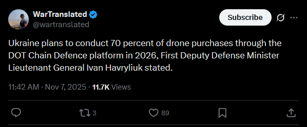 Ukraine plans to conduct 70 percent of drone purchases through the DOT Chain Defence platform in 2026, First Deputy Defense Minister Lieutenant General Ivan Havryliuk stated.https://x.com/wartranslated/status/1986761187225149586