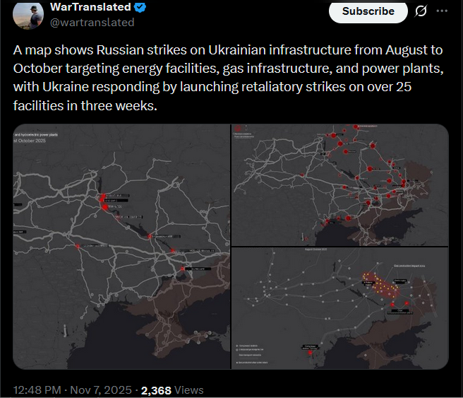 A map shows Russian strikes on Ukrainian infrastructure from August to October targeting energy facilities, gas infrastructure, and power plants, with Ukraine responding by launching retaliatory strikes on over 25 facilities in three weeks.https://x.com/wartranslated/status/1986777774506250302pic 1https://files.catbox.moe/47opo8.jpgpic 2https://files.catbox.moe/tyjz0y.jpgpic 3https://files.catbox.moe/a6dq32.jpg