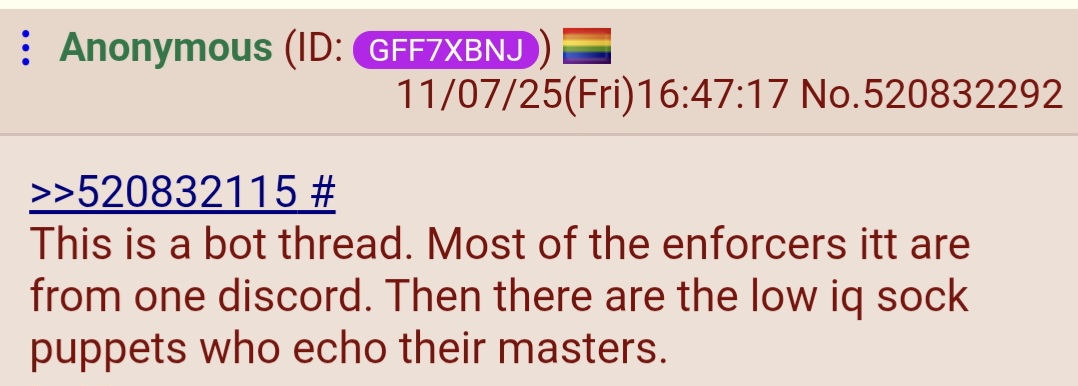 >>520832115This is a bot thread. Most of the enforcers itt are from one discord. Then there are the low iq sock puppets who echo their masters.