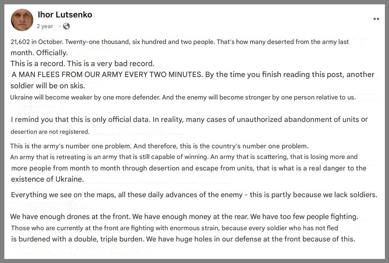 >there is a difference between AWOL (absent without leave) and desertion (leaving)....>in ukraine nearly every soldier i know of at one time has gone AWOL...>to change units>missing a vehicle or train>going to see wife and kids for a day>etc......>the punishment for AWOL is light and in the vast majority of cases its tolerated somewhat as long as its not at the front. >desertions (leaving the AFU permanently) are relatively RARE!!!!>there stop being dumb asses over misleading reports