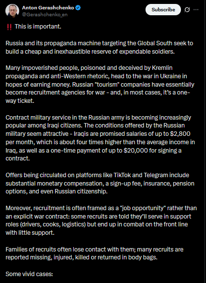 >Russia and its propaganda machine targeting the Global South seek to build a cheap and inexhaustible reserve of expendable soldiers.