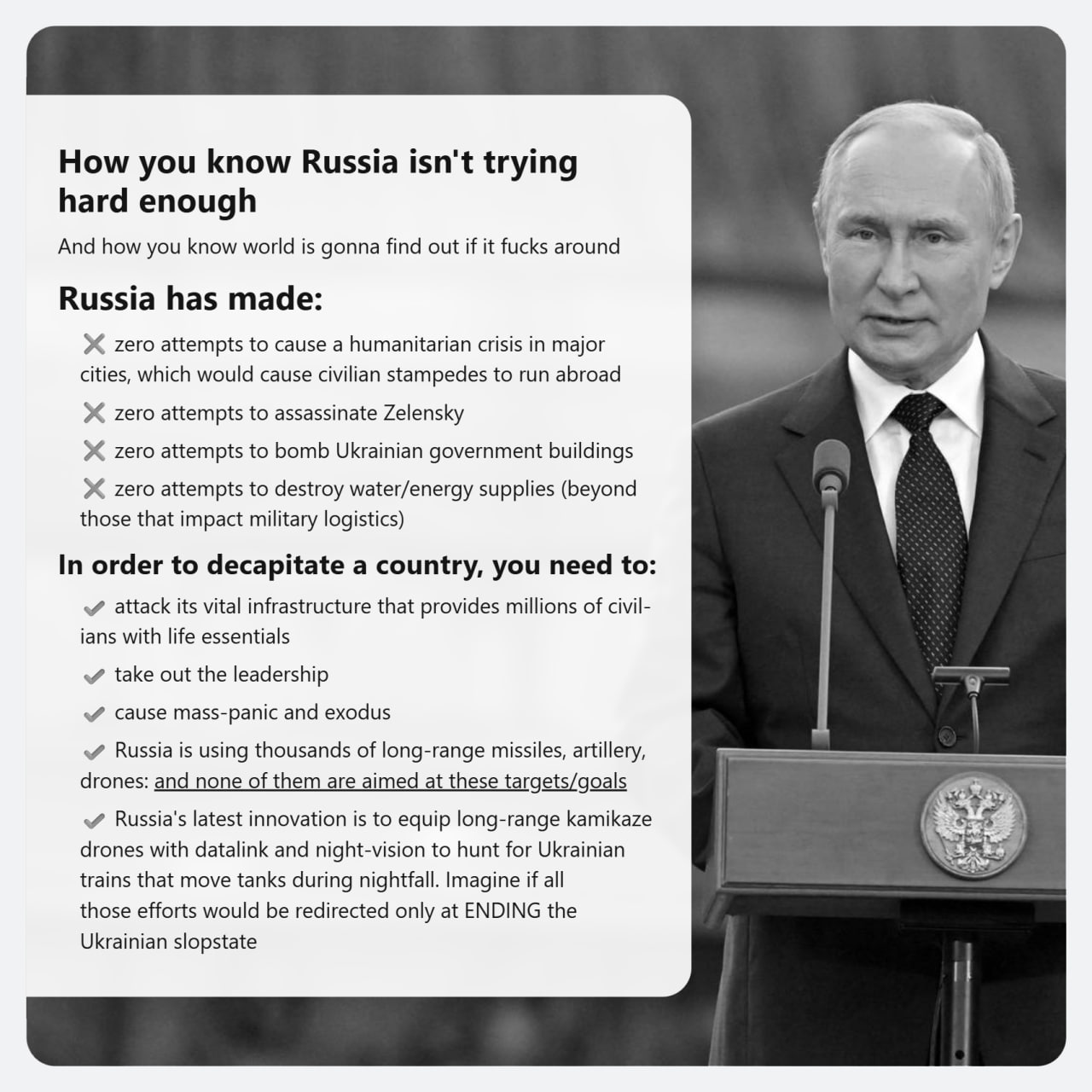 >>521048951Discussing this on /chug/ is pointless. You'll be told how>attacking civilian electrical infrastructure is something only wectoids and kikes do and Russia is too pure and good for that even in warThen Russia all but collapses Ukraine's electrical infra in a series of strikes (thus also cutting off water and sanitation/sewage for huge swaths of the county) so the goalposts get moved to...>a decapitation strike is something only wectoids and kikes blah blah blah...despite the fact that Agent Z's removal (whether via Kinjal or coup) is both inevitable AND required for any kind of negotiation to take place.