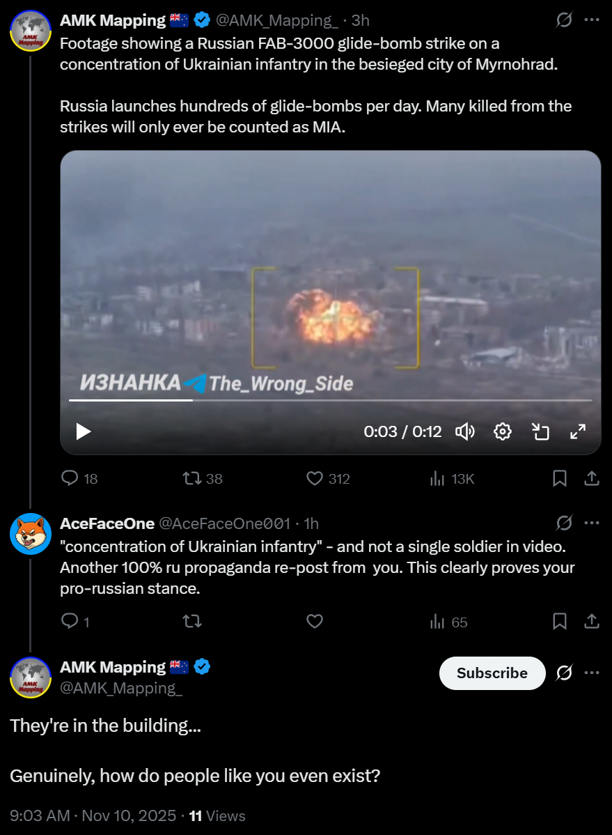 >>521051832>just denied Zelenskike's orderesThis is what Mercouris speculates in his latest video: https://www.youtube.com/watch?v=a9zvsdmk_xgNamely that the disjointed statements on Pokrovsk indicate a potential shift in civilian/military order.>Zele ranted how Porkroast must be held at all costs>Instead of agreeing his generals said they will take action, but it must remain secret>>521051928>how is the war going?Good.>Who is "winning"?Russia.>Any chance its gonna end sooner?The sooner foreign money stops coming in the sooner the war will end.