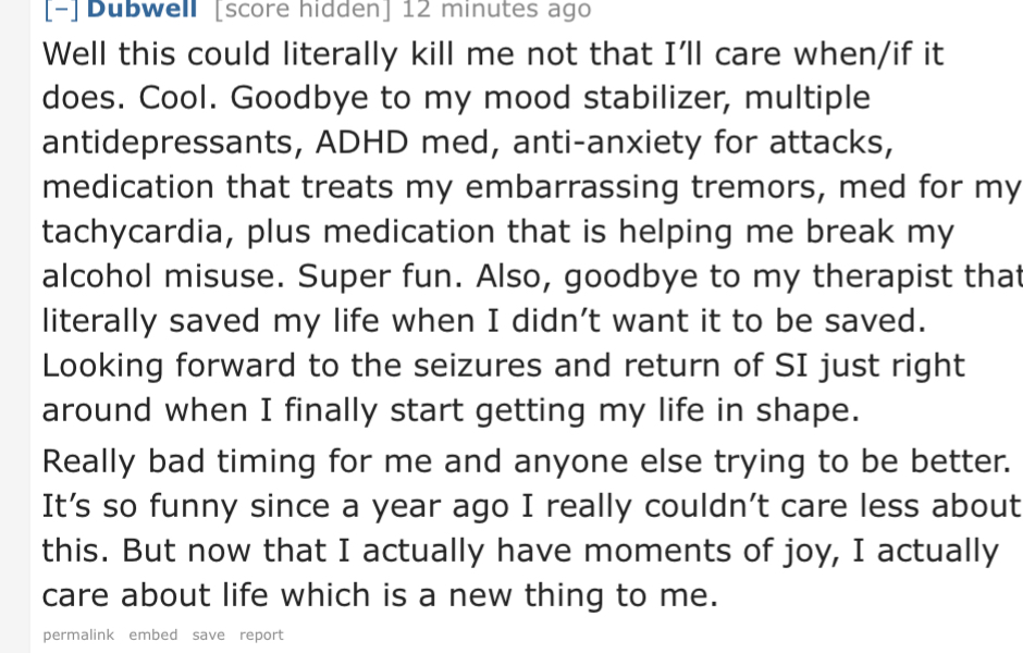 >>521079194>how will I pay for the thousands of dollars worth of therapy and medications to treat the medications I take because I can't just nut up