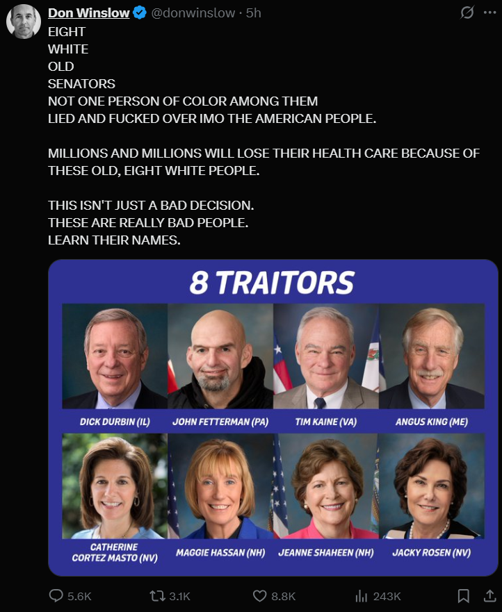 Is it not suspicious that we got exactly 60 votes to end the shutdown and the 8 democrats who voted no aren’t running for re-election?