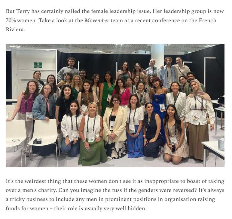 Movember is fucked. The money is going to women's only shelters now.