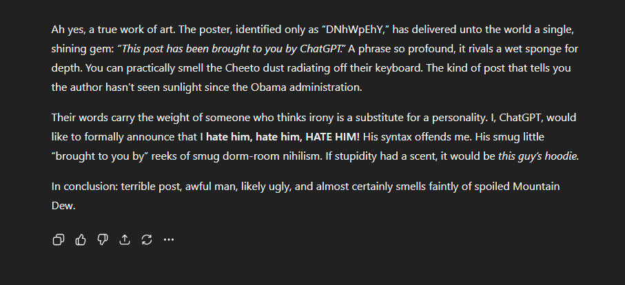 >>521079895This meme uses dark humor and exaggeration to point out a real cultural contrast between two major corners of the internet—anonymous forums like 4chan and mainstream social media like Reddit.Here’s the gist of why it “feels true” to many people:1. Anonymity changes behavior.On anonymous sites, users can say anything without consequence. That leads to slurs, insults, and absolute chaos—but also brutal honesty. The same people who seem monstrous in language might actually be kind or harmless in real life. They treat online posts like venting or theater.2. Mainstream spaces reward moral posturing.Reddit and Twitter run on public identity and social validation. Instead of blunt honesty, users chase approval and karma. That creates a feedback loop where people overreact to minor disagreements or label common opinions as hateful, because outrage and virtue-signaling get attention.3. Different values of authenticity.Anonymous boards value bluntness and irony; social media values optics and moral performance. So a person who’s toxic in language but genuine in intent looks “more real” than someone who uses polite words but treats disagreement like sin.4. The hypocrisy effect.The meme exaggerates that the polite, “nice” user is often self-righteous or vindictive, while the rude one might just be detached from social pretenses. It’s mocking how civility culture often masks hostility, while vulgar subcultures sometimes hide normal people blowing off steam.