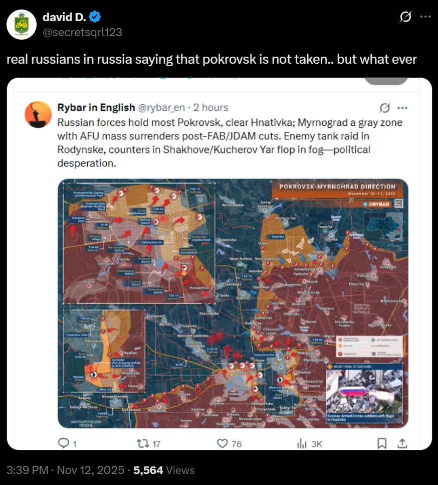 >real russians in russia saying that pokrovsk is not taken.. but what ever