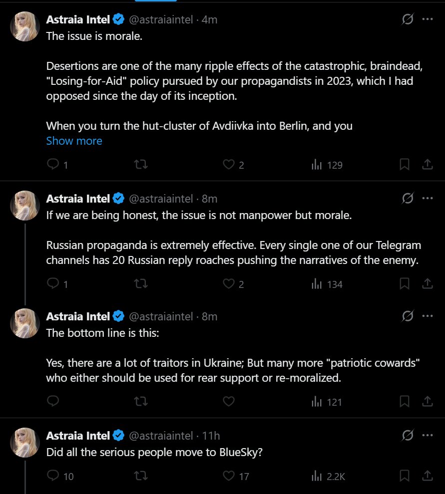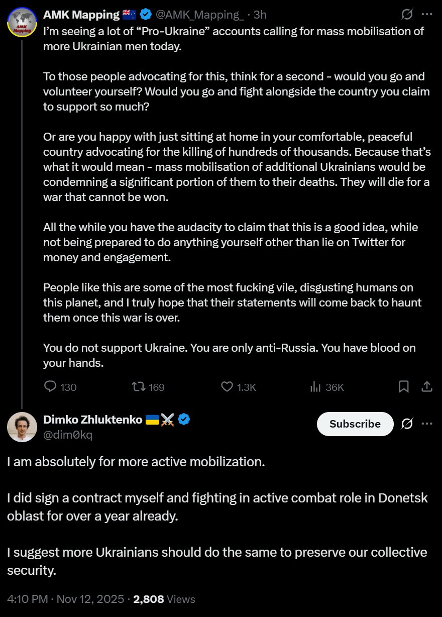 >I’m seeing a lot of “Pro-Ukraine” accounts calling for mass mobilisation of more Ukrainian men today. >To those people advocating for this, think for a second - would you go and volunteer yourself? Would you go and fight alongside the country you claim to support so much? >Or are you happy with just sitting at home in your comfortable, peaceful country advocating for the killing of hundreds of thousands. Because that’s what it would mean - mass mobilisation of additional Ukrainians would be condemning a significant portion of them to their deaths. They will die for a war that cannot be won. >All the while you have the audacity to claim that this is a good idea, while not being prepared to do anything yourself other than lie on Twitter for money and engagement. >People like this are some of the most fucking vile, disgusting humans on this planet, and I truly hope that their statements will come back to haunt them once this war is over. >You do not support Ukraine. You are only anti-Ru