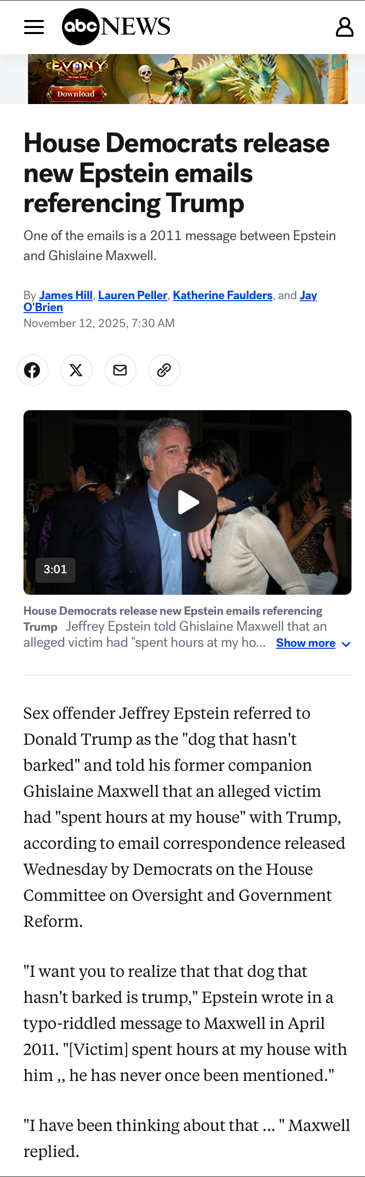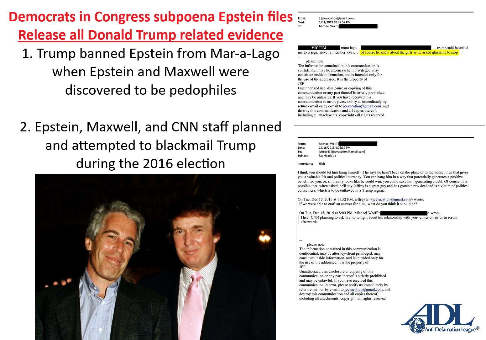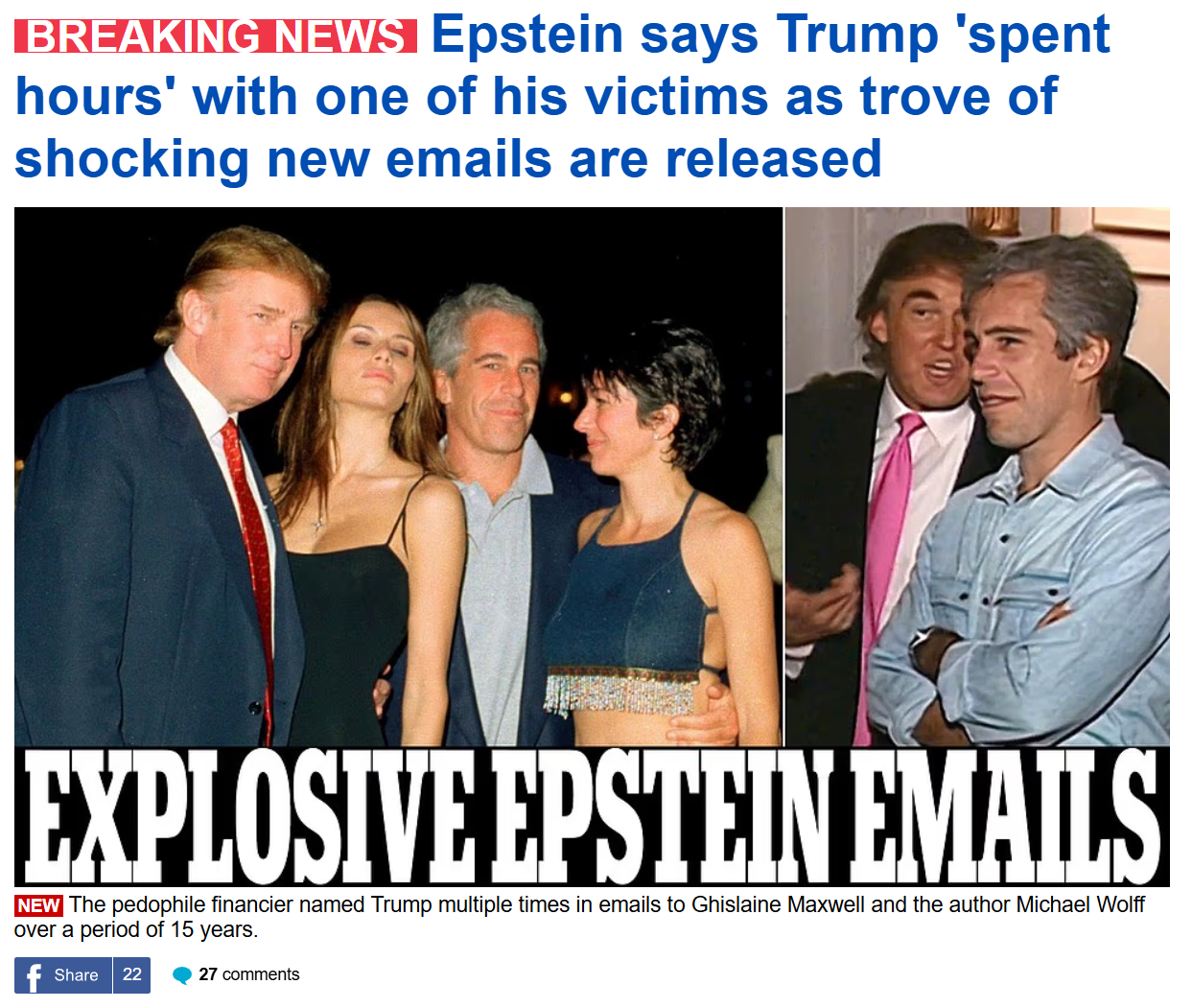 >In another email from April 2011, Epstein claimed to Maxwell that Trump had “spent hours” with a victim, whose name is redacted.
