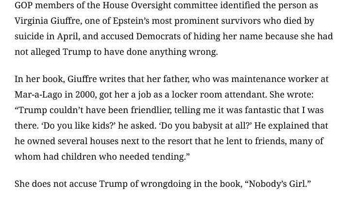 >GOP members of the House Oversight committee identified the person as Virginia Giuffre, one of Epstein’s most prominent survivors who died by suicide in April, and accused Democrats of hiding her name because she had not alleged Trump to have done anything wrong.