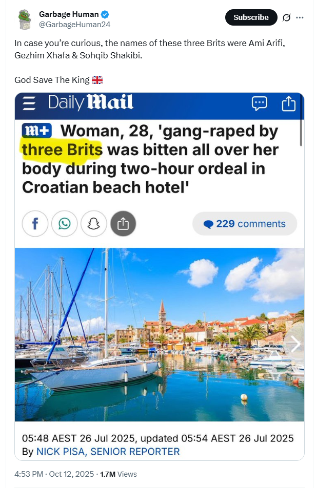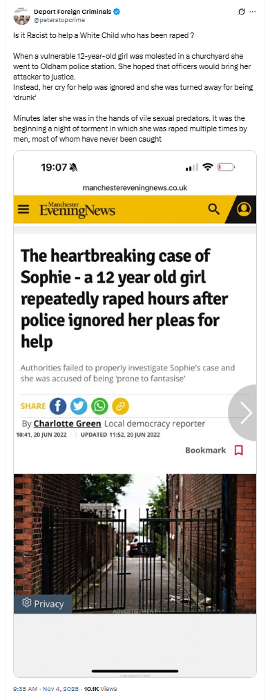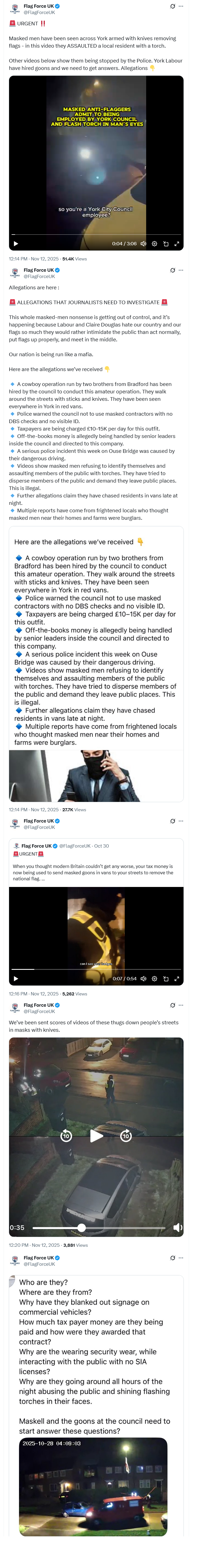 https://xcancel.com/dampierguy/status/1988561662513651794#m>Masked men have been seen across York armed with knives removing flags - in this video they ASSAULTED a local resident with a torch. >Other videos below show them being stopped by the Police. York Labour have hired goons and we need to get answers. Allegations >Serious allegations about York Council hiring masked thugs to pull down national flags put up by local patriots. The video evidence provided shows that something untoward is happening. Journalists should look into this more deeply.Something's brewing