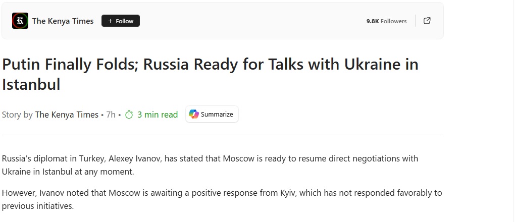 https://www.msn.com/en-us/news/world/putin-finally-folds-russia-ready-for-talks-with-ukraine-in-istanbul/ar-AA1QhffKIt is coming! Russia is folded. They are ready for talks with Ukraine in Istanbul! It finally is time to end the war and the war can be ended in Istanbul. President Erdogan can whip both of their asses into sitting down like unruly children they are!