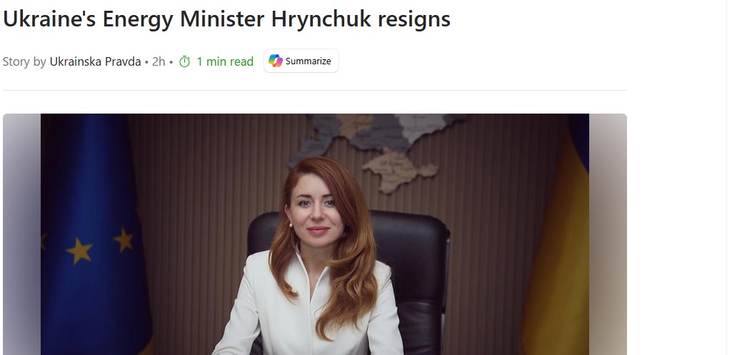 https://www.msn.com/en-us/news/world/ukraine-s-energy-minister-hrynchuk-resigns/ar-AA1QiCmqThe Ukrainian energy minister has resigned - I dont think it is appropriate. You cant blame her for what Russia did wrong to Ukraine!