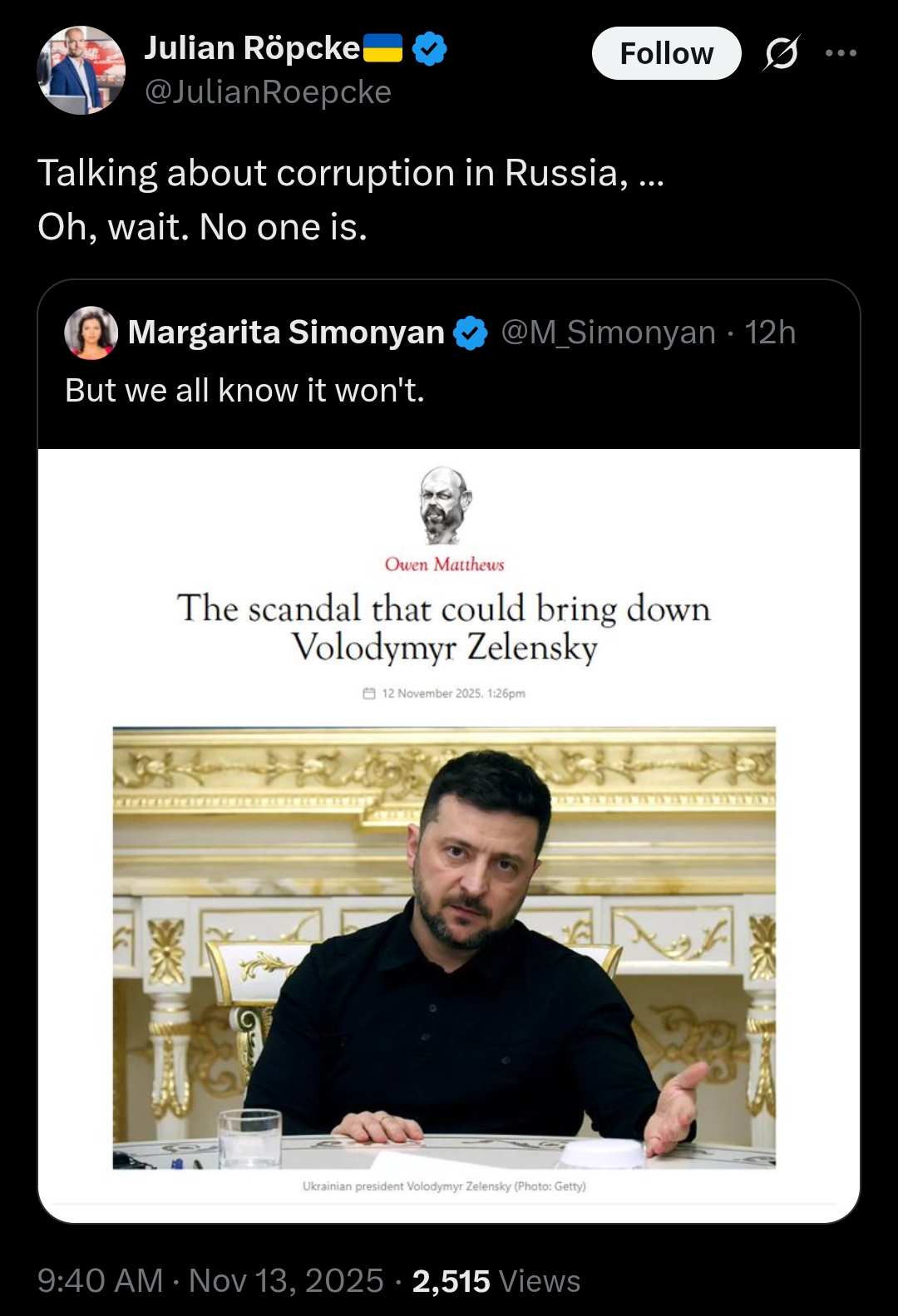 >I'd applaud if Russia was in any way capable of intercepting any Ukrainian head of state (or close)