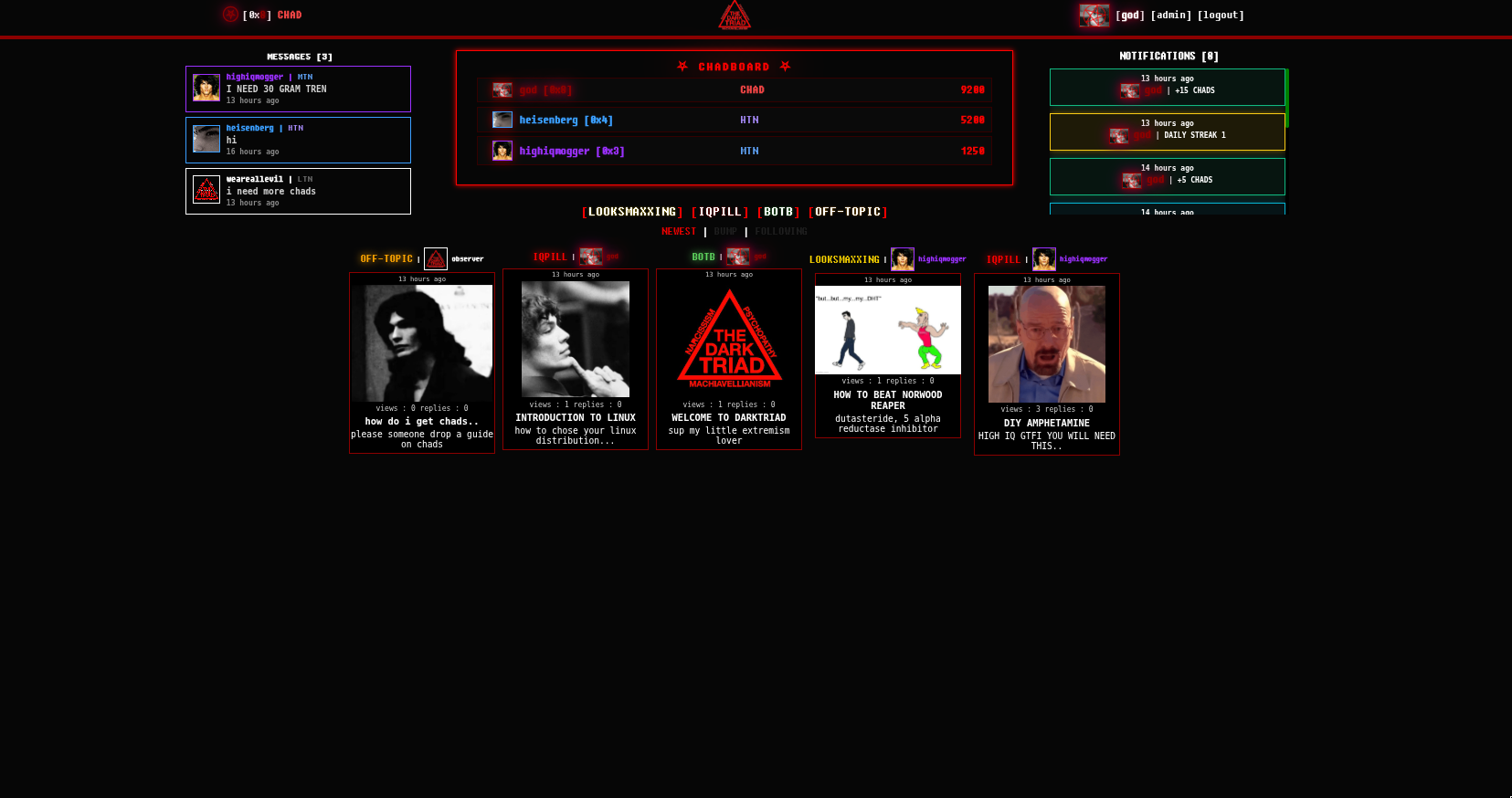 darktriad, its gonna be a forum like thingy i wrote, its mostly about combining tech autists with blackpill looksmaxxing autists. I have been working on it for couple weeks now.0% bloat javascript, its all written in go using the native net/http library with sqlite3 no other bullshit bloat that we dont need. It's gonna be about how you can synthesise your own neurostimulants(amphetamines, modafinil, etc). About hacking, programming, looksmaxxing etc.Yes it is for cringy edgy teens or whatever you boring boomer, thats the whole point of it.BUY AD MY ASS BITCH.