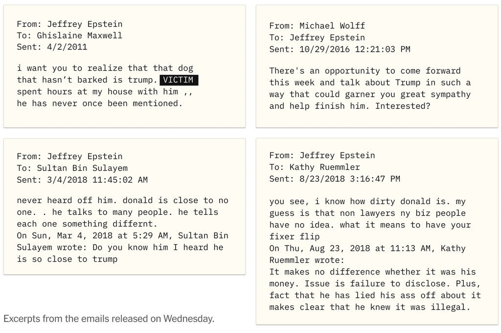 Just remember that Republicans are also intent on releasing the Epstein files and have released those emails together with Democrats, so the usual "this is a Biden plot" cope doesn't work here. In fact no member of congress is doubting the authenticity of those new emails to my knowledge. The only one saying those are fake are Trump, his lying mouth piece Levitte, and apparently (you).